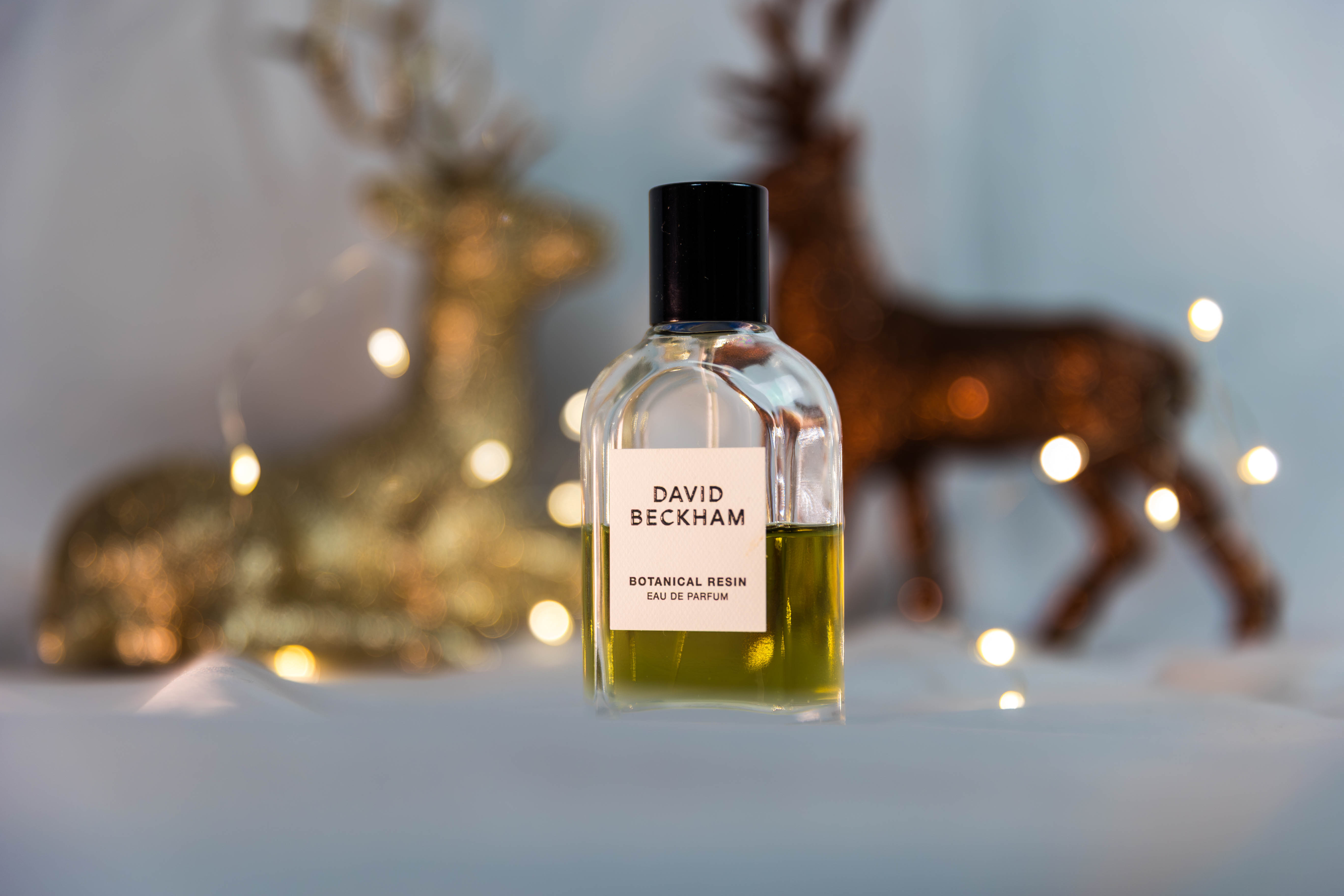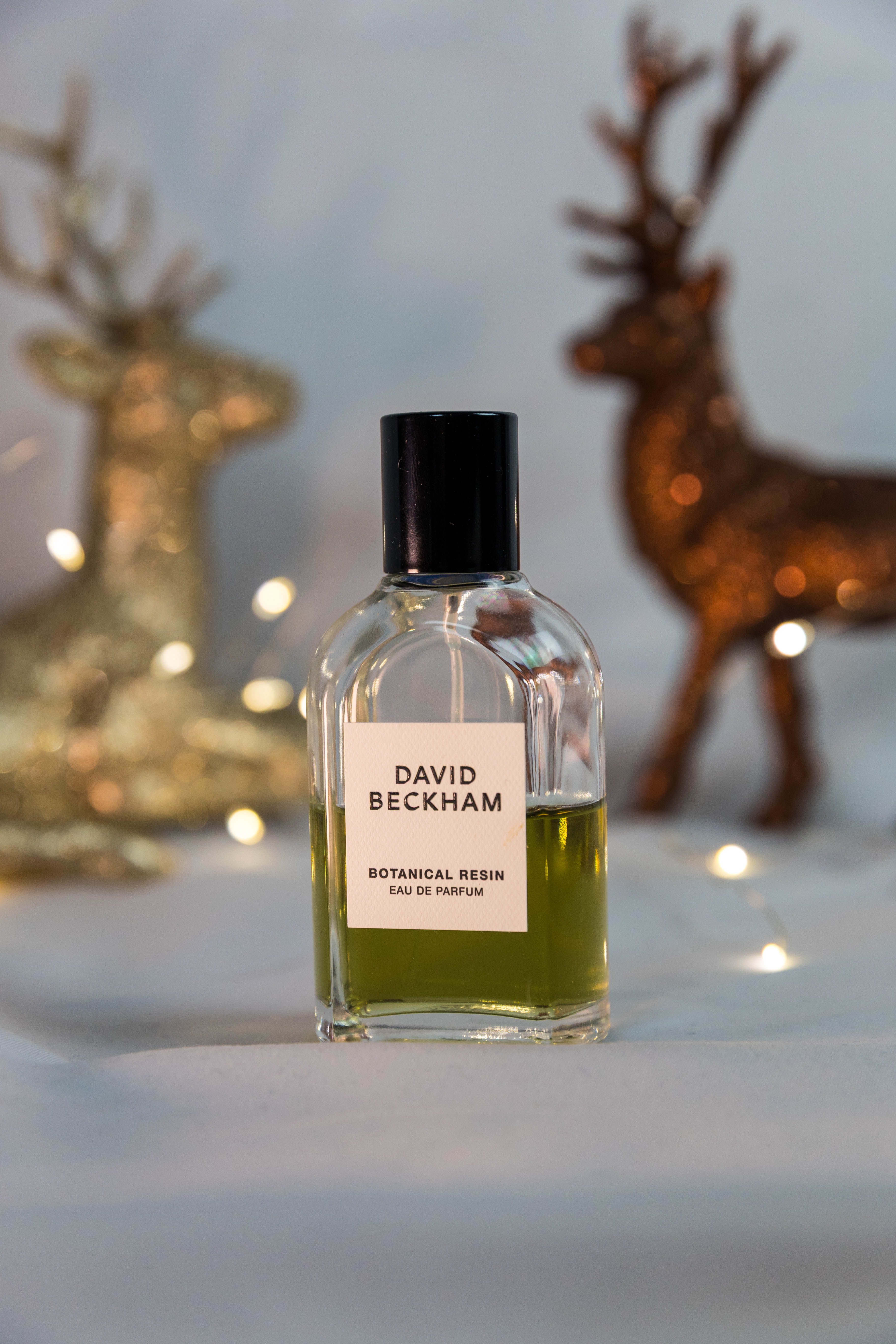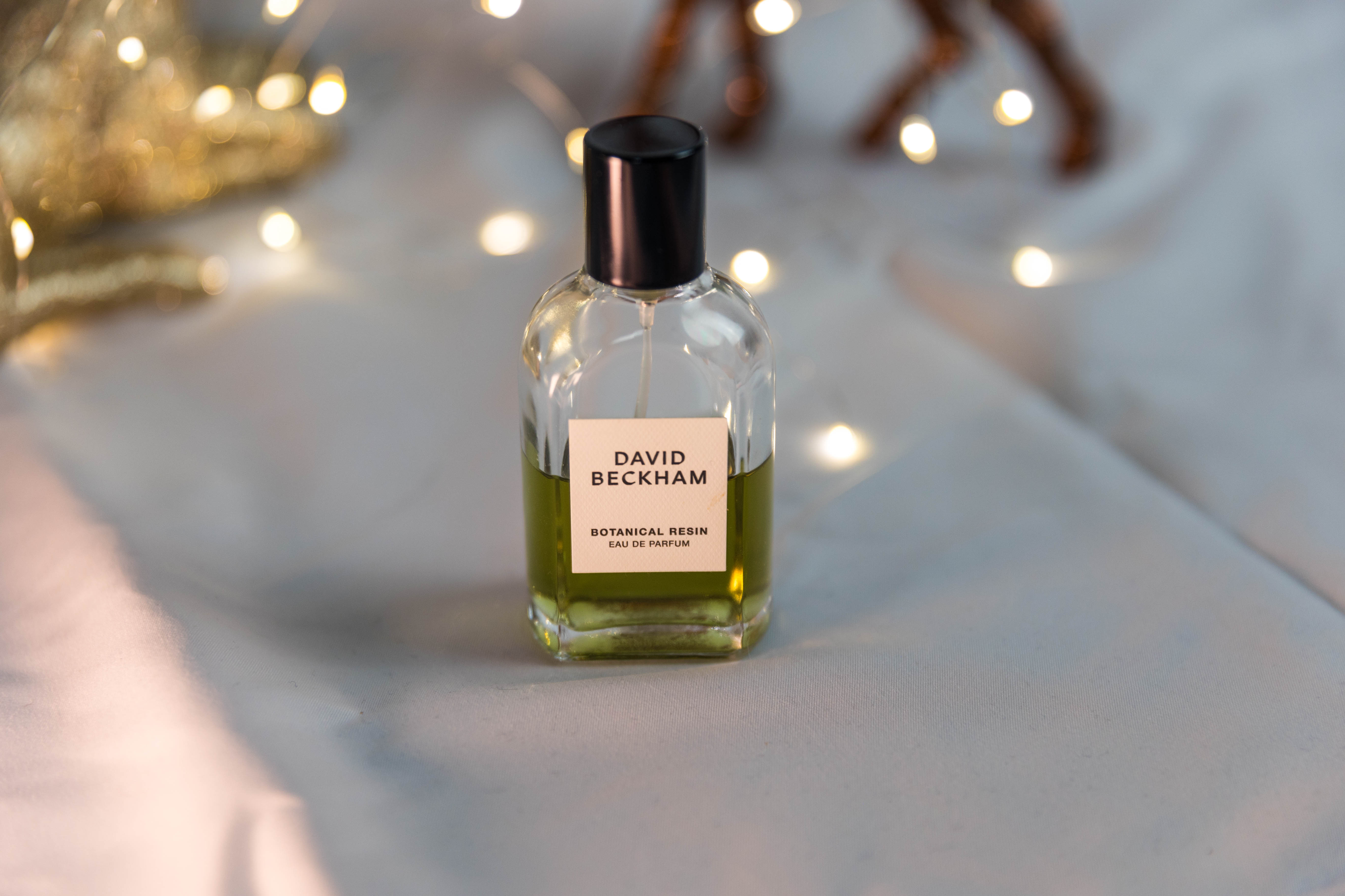 Im Mittelpunkt steht ein Eau de Parfum von David Beckham, präsentiert in einem warmen Weihnachts-Setting mit Bokeh-Lichtern und goldenen Accessoires.
