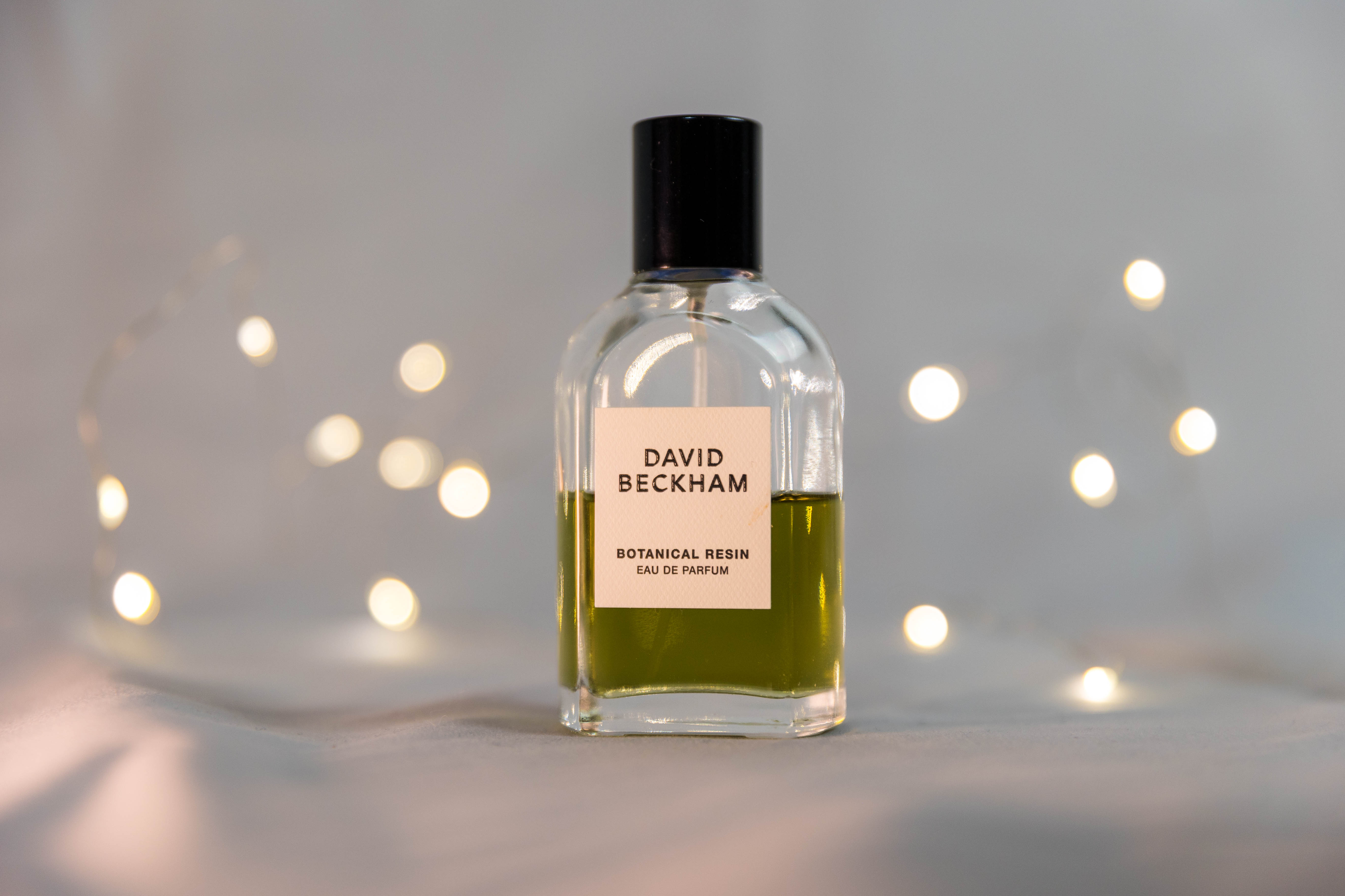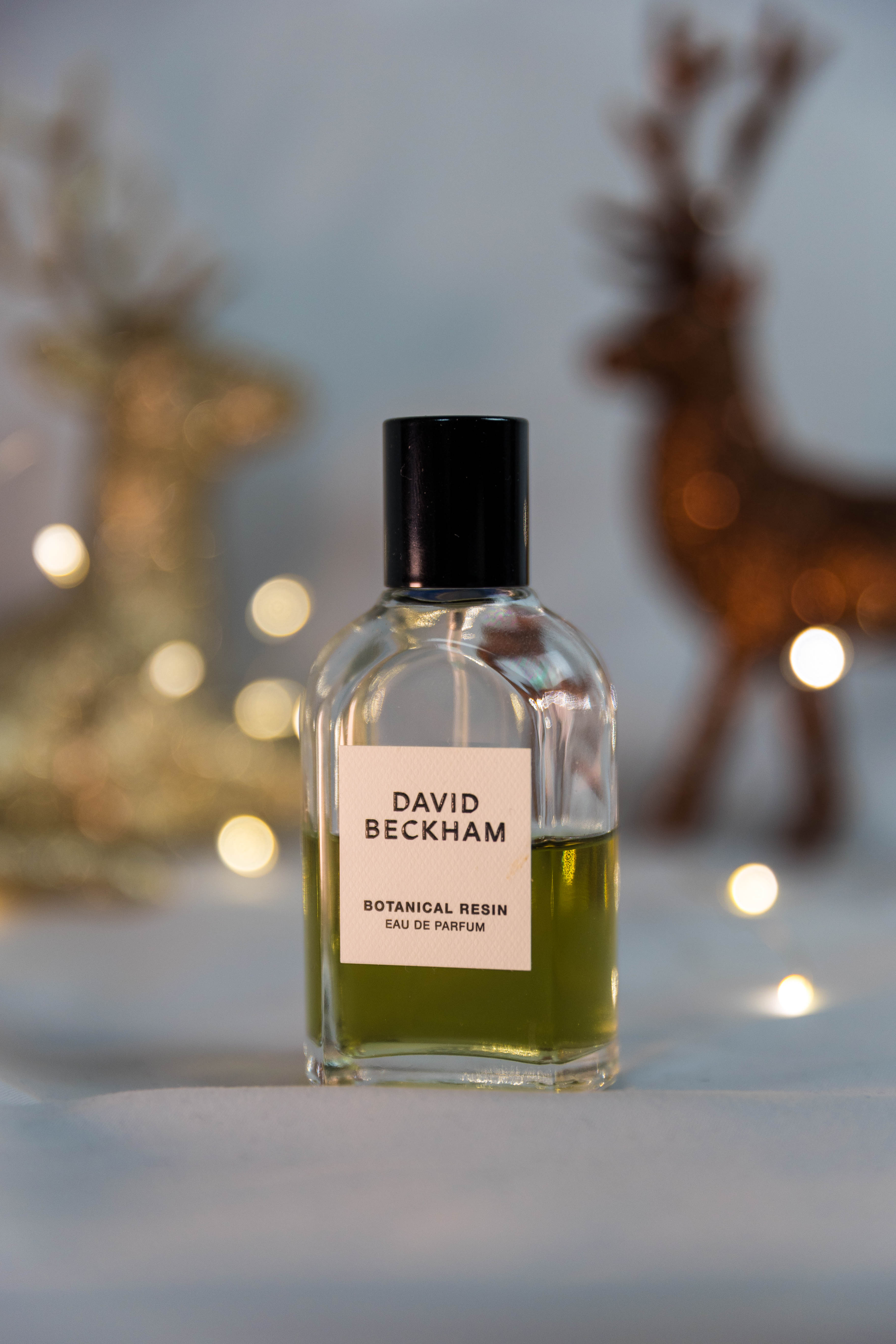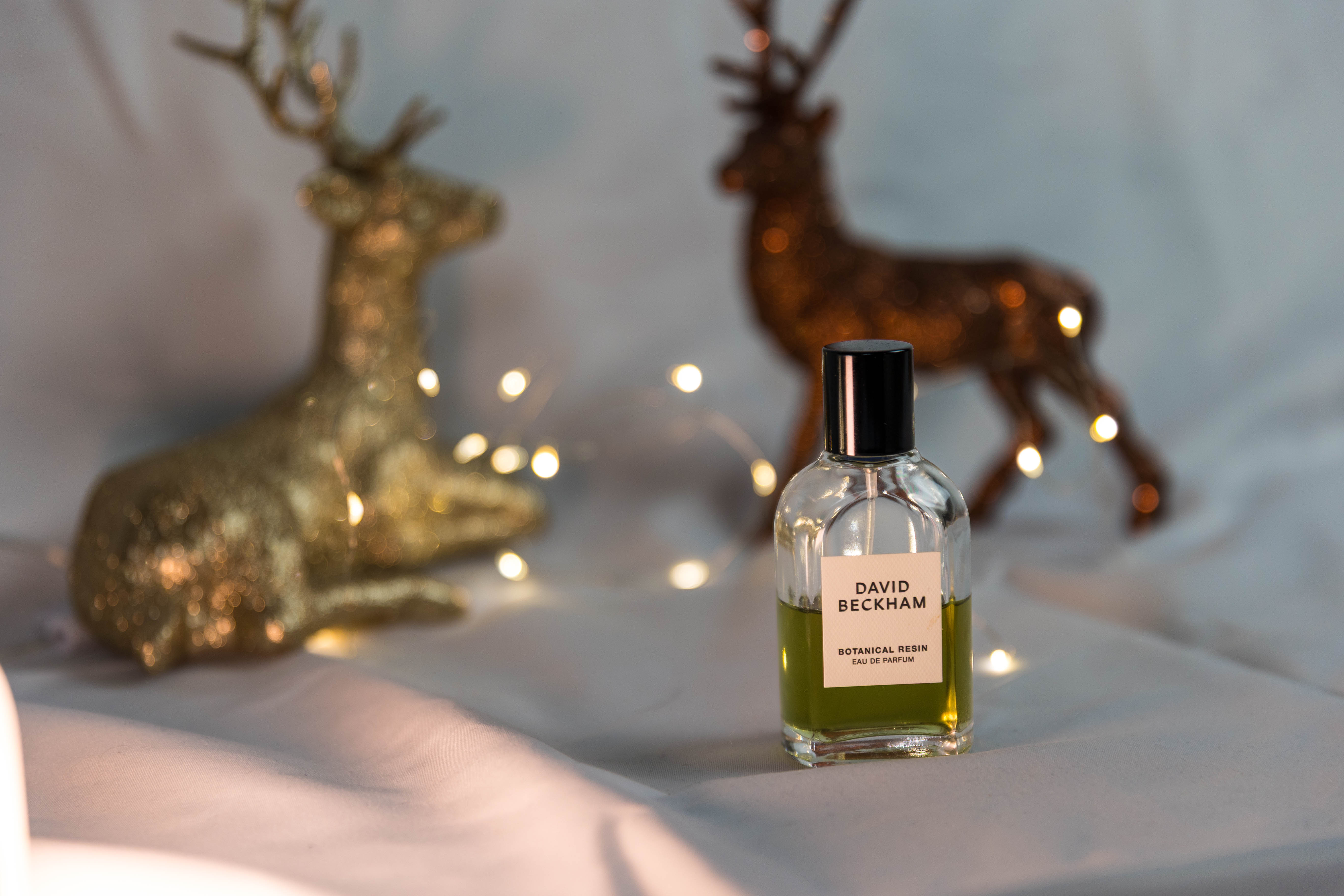 Im Mittelpunkt steht ein Eau de Parfum von David Beckham, präsentiert in einem warmen Weihnachts-Setting mit Bokeh-Lichtern und goldenen Accessoires.