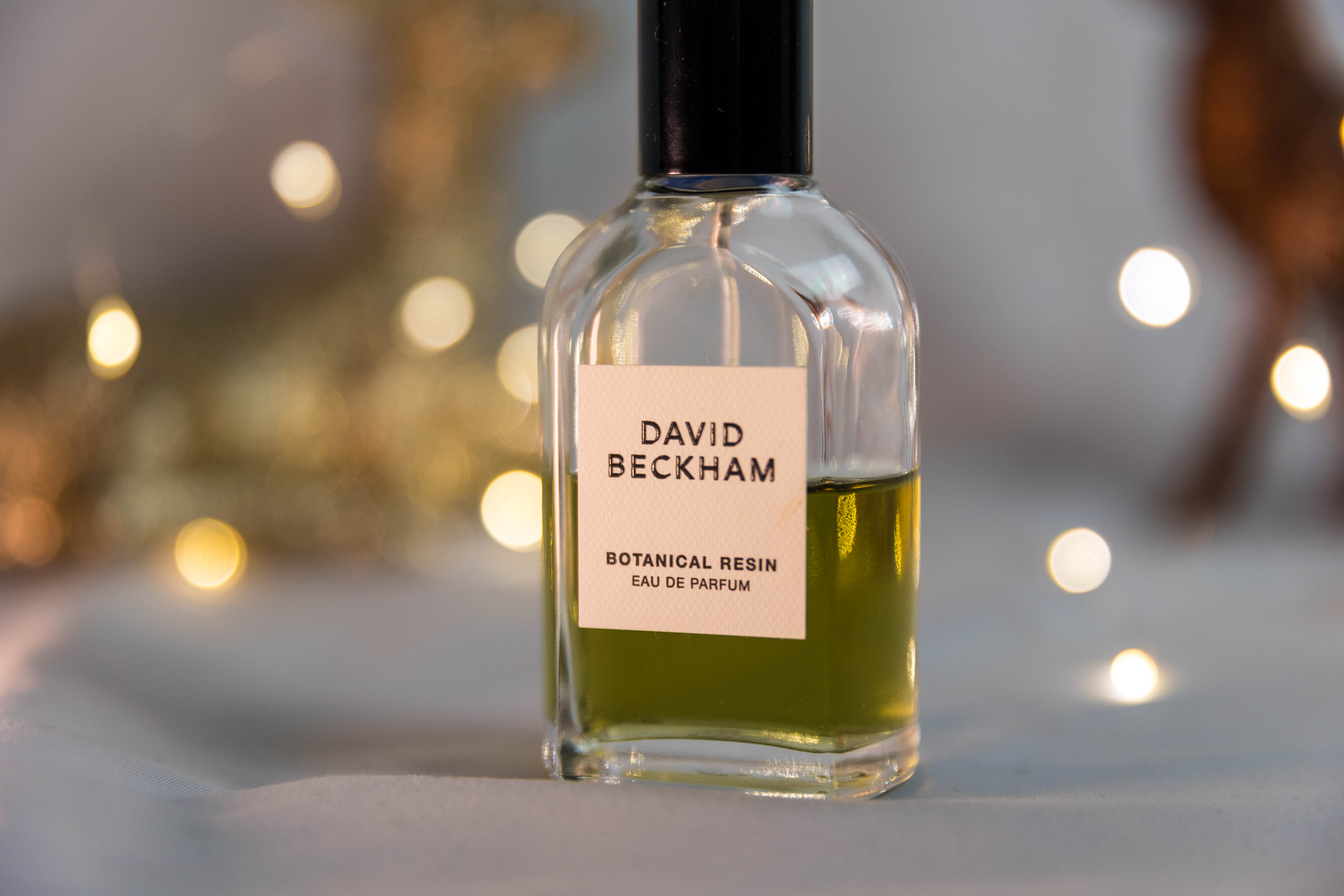 Im Mittelpunkt steht ein Eau de Parfum von David Beckham, präsentiert in einem warmen Weihnachts-Setting mit Bokeh-Lichtern und goldenen Accessoires.